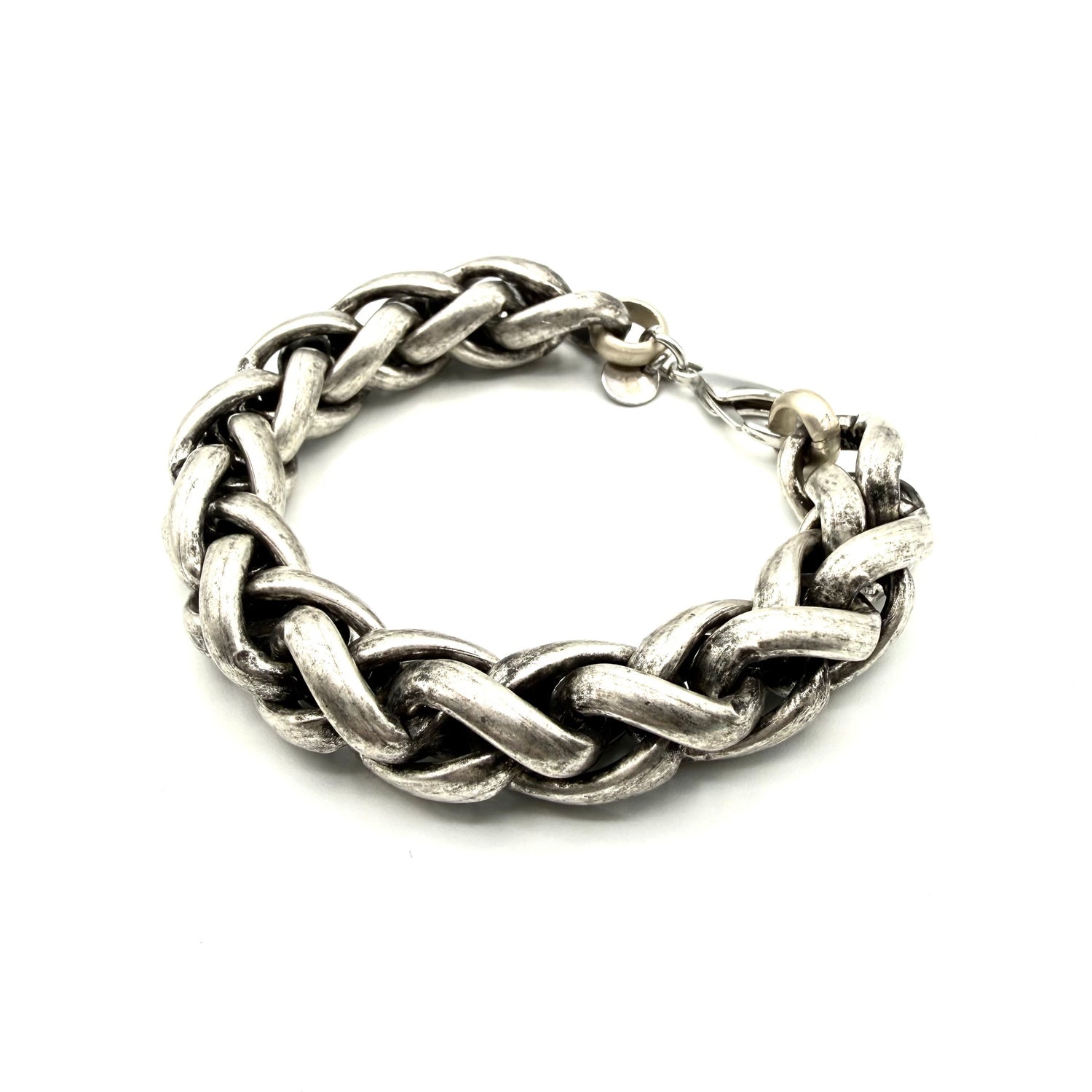 Bracciale maglia Spiga in Ottone con finitura in Argento antico, interamente lavorato a mano in Italia secondo le più sapienti tecniche artigianali.