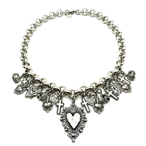 Collana maglia rolò in Alluminio con ciondoli porta fortuna e Cuori Sacri in Zama interamente lavorato a mano secondo le più sapienti tecniche artigianali.