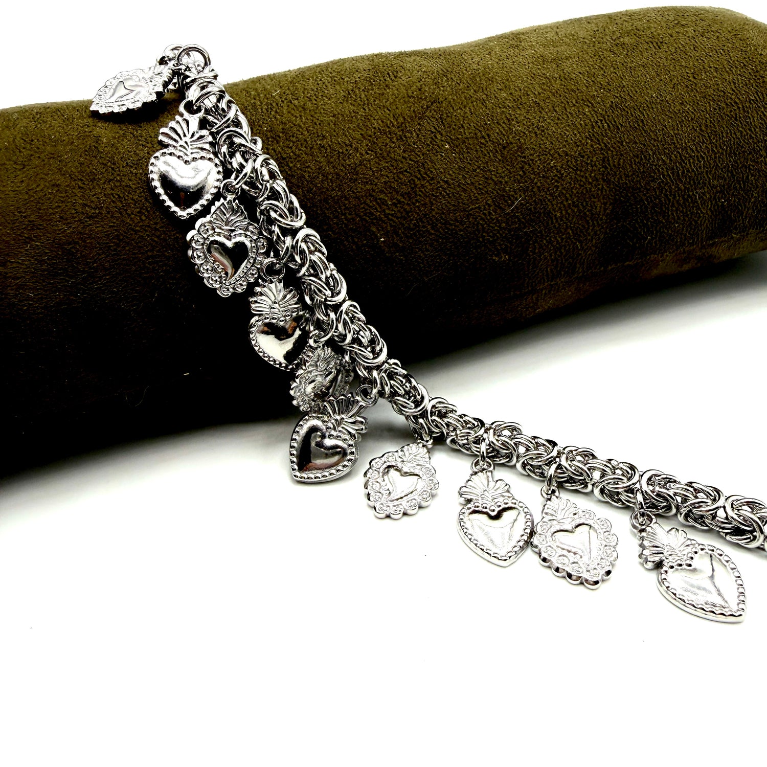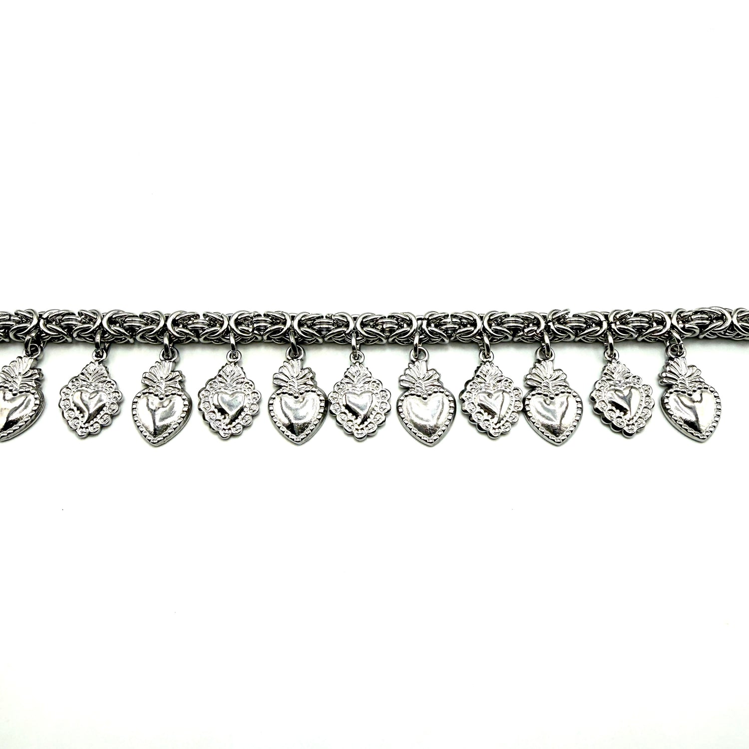 Bracciale Catena bizantina con applicazione di charm Cuori sacri in acciaio inossidabile interamente lavorato a mano secondo le più sapienti tecniche artigianali.