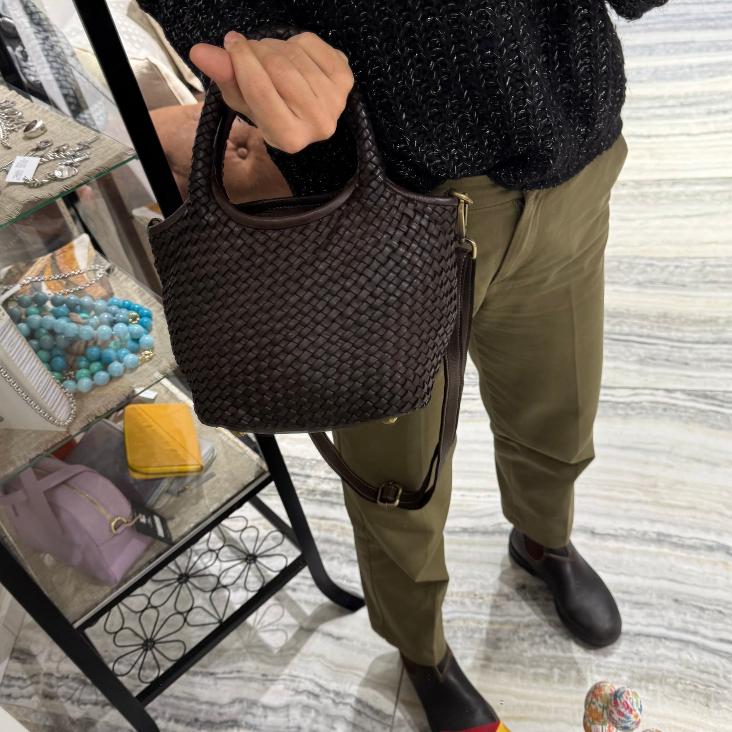 Borsa in vera pelle di vitello lavato intrecciata interamente a mano in Italia secondo le più antiche tecniche artigianali dotata di chiusura con cerniera e tracolla sino a 110 cm, doppia tasca interna con cerniera e porta cellulare.