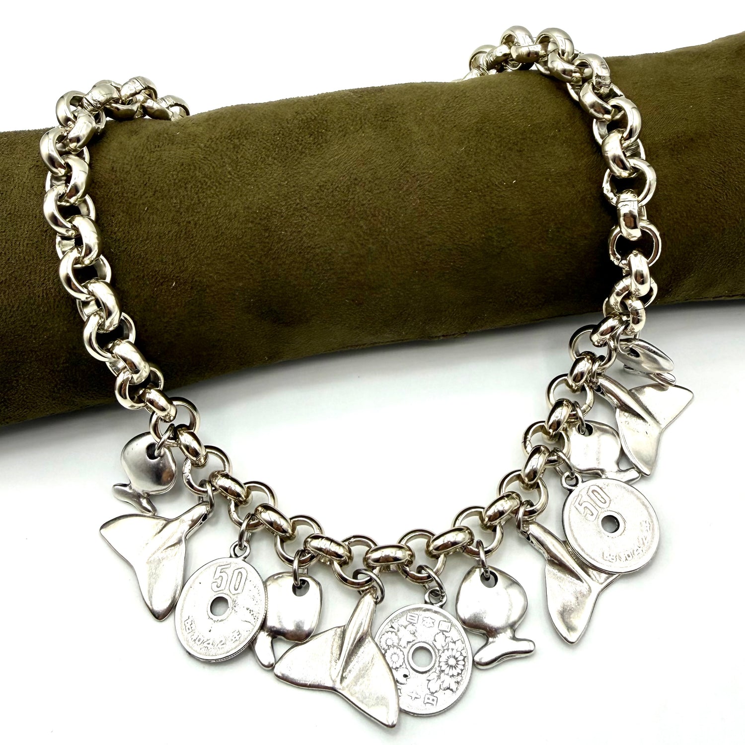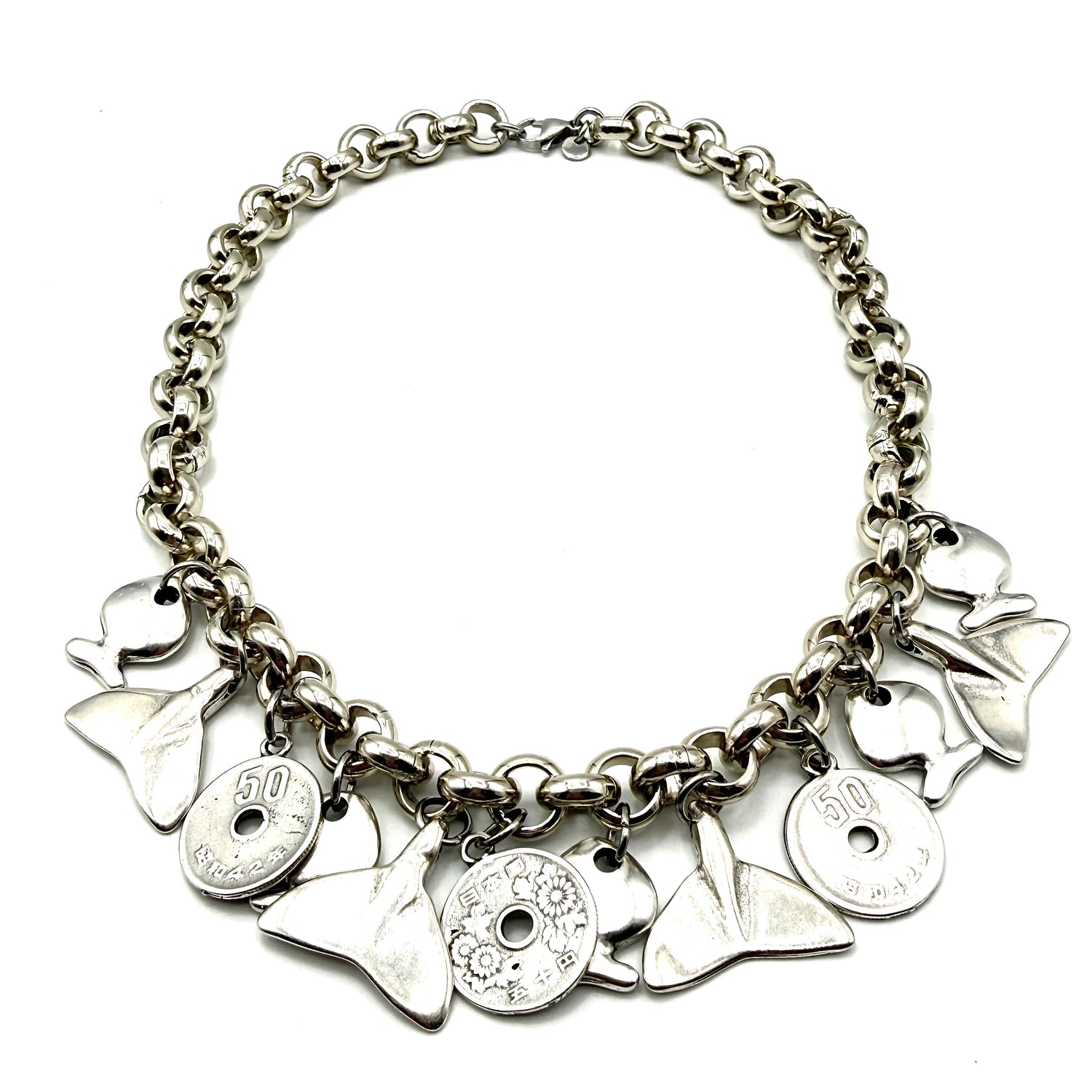 Collana Maglia rolò in Alluminio con finitura in Argento antico e ciondoli Coda di Balena, pesce e moneta in Zama, interamente lavorata a mano in Italia secondo le più sapienti tecniche artigianali.
